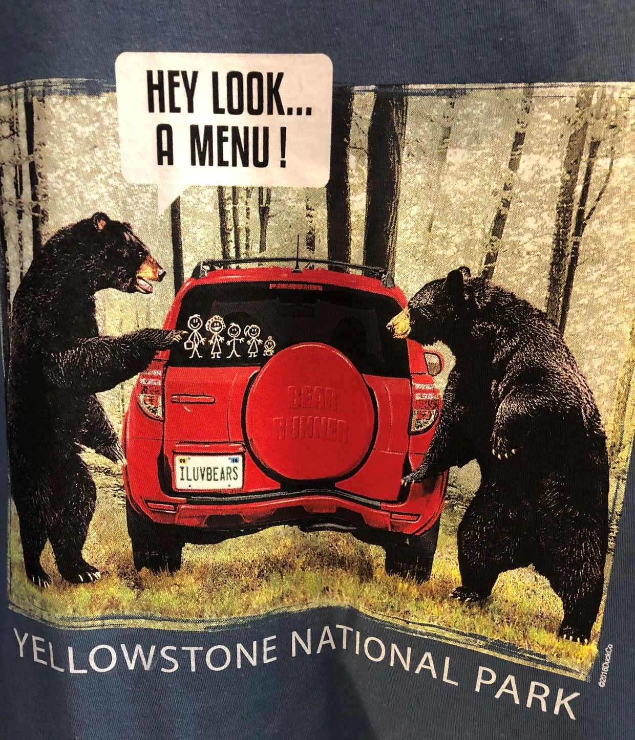On our last day in Yellowstone we drove into the town of West Yellowstone early and went to the IMAX theatre just outside West Gate. It's a beautiful facility. They have a six story screen and a theatre that seats 300 people. We were there for the 10:00 am showing of their nature film on Yellowstone. It provided a lot of history and breathtaking visual images and sounds in the way that only a gigantic IMAX screen and a top notch Dolby sound system can. It was very worthwhile. After that we spent a little time touring shops. Many had Indian jewelry and local art pieces with nature themes. There were two first rate Outfitters in the town. They were really impressive. They carried first class fishing and camping gear for the serious angler and hiker/backpacker. This was expensive stuff, but exactly the kind of high performance gear you would want if you were serious about your sport and needed to be prepared to handle unexpected surprises in the wild. One of the other things we got a real kick out of were the many hilarious T-Shirts that seem to be unique to Yellowstone. The best ones involve not so vague references to bears versus tourist encounters - spoiler alert, the bears win every time! Reflecting on our time in Yellowstone, Diane and I are very happy with the whole experience. Before we actually set out on our trip, we weren't certain we would be able to master the many experiences available here. It turned out that we really lucky in our choices and timing. We leave Yellowstone with a lifetime of memories to look back on. We hope you have enjoyed our blog on Yellowstone, "Volcano Walk," and the many pictures we have posted.